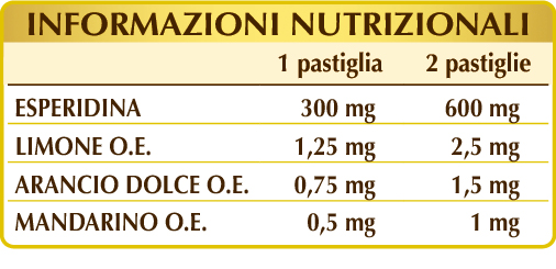 Esperidina da agrumi, cellulosa microcristallina°, gomma arabica°, silicio biossido°°, magnesio stearato di origine vegetale°°, limone (Citrus limon Burm) scorze dei frutti O.E., arancio dolce (Citrus aurantium var. sinensis o dulcis) scorze dei frutti O.E., mandarino (Citrus reticulata) scorze dei frutti O.E.