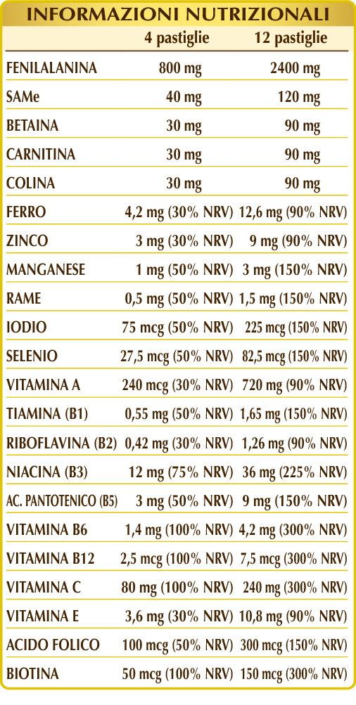 (L-)fenilalanina, cellulosa microcristallina°, gomma arabica°, SAMe (S-adenosil metionina disolfato tosilato), vitamina C (acido ascorbico), colina tartrato, ferro gluconato, (L-)carnitina, betaina, silicio biossido°°, zinco gluconato, vitamina B3 (nicotinamide), magnesio stearato di origine vegetale°°, manganese gluconato, vitamina E di origine naturale (acetato di D-α-tocoferile), rame gluconato, vitamina B5 (pantotenato di calcio), vitamina B6 (piridossina), vitamina A (acetato di retinile), vitamina B1 (tiamina), vitamina B2 (riboflavina), acido folico, potassio ioduro, sodio selenito, biotina, vitamina B12 (cianocobalamina).