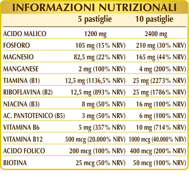 Integratore di acido malico, arricchito con minerali e vitamine. Il magnesio favorisce la normale funzione muscolare, contribuisce alla normale sintesi proteica e con fosforo e manganese promuove il mantenimento della salute delle ossa; inoltre, con vitamina B12 e acido folico interviene nel processo di divisione cellulare, con vitamine B1, B2, B3, B6, B12 e biotina sostiene il funzionamento del sistema nervoso e con vitamine B2, B3, B5, B6, B12 e acido folico aiuta a ridurre stanchezza e affaticamento. Infine, il manganese contribuisce alla normale formazione dei tessuti connettivi mentre con magnesio, fosforo, vitamina B1, B2, B3, B5, B6, B12 e biotina favorisce il normale metabolismo energetico.
