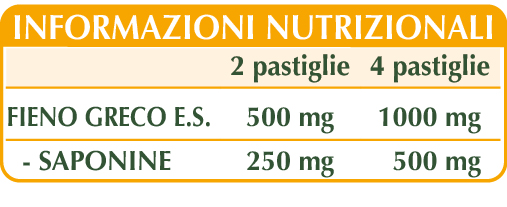 Fieno greco (Trigonella foenum-graecum) semi E.S. (titolato al 50% in saponine), maltodestrine da mais o riso, cellulosa microcristallina°, gomma arabica°, silicio biossido°°, magnesio stearato di origine vegetale°°.