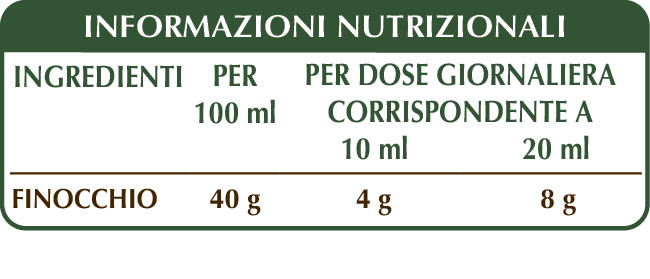 Estratto Integrale Liquido analcoolico ottenuto a partire da: glicerina vegetale bidistillata, acqua pura, finocchio (Foeniculum vulgare) frutti.