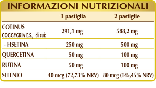 Cotinus coggygria (Cotinus coggygria) cortecce E.S. (titolato all’85% in fisetina), cellulosa microcristallina°, rutina, quercetina, gomma arabica°, silicio biossido°°, magnesio stearato di origine vegetale°°, sodio selenito.