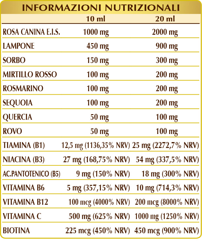 Glicerina vegetale bidistillata, acqua pura, rosa canina (Rosa canina) frutti E.I.S. (titolato al 50% in vitamina C); macerato glicerico di tessuti meristematici freschi di: lampone (Rubus idaeus) giovani getti, sorbo (Sorbus domestica o Pyrus sorbus) gemme, mirtillo rosso (Vaccinium vitis-idaea) giovani getti, rosmarino (Rosmarinus officinalis) giovani getti, sequoia (Sequoia gigantea o Sequoiadendron giganteum) gemme, quercia (Quercus peduncolata o Quercus robur) gemme, rovo o mora di macchia (Rubus fruticosus) giovani getti; vitamina B1 (tiamina cloridrato), vitamina B3 (niacina, nicotinamide), vitamina B5 (pantotenato di calcio), vitamina B6 (piridossal-5-fosfato), biotina, vitamina B12 (metilcobalamina, 5-deossiadenosilcobalamina).