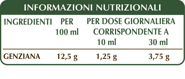 Estratto Integrale Liquido analcoolico ottenuto a partire da: glicerina vegetale bidistillata, acqua pura, genziana (Gentiana lutea) radici.