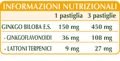 Ginkgo biloba (Ginkgo biloba) foglie E.S. (titolato al 24% in ginkgoflavonoidi e al 6% in lattoni terpenici), maltodestrine da mais o riso, cellulosa microcristallina°, gomma arabica°, silicio biossido°°, magnesio stearato di origine vegetale°°.