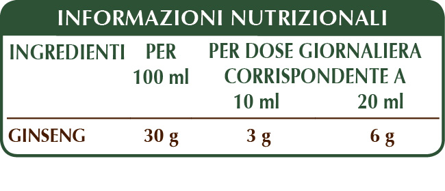 Estratto Integrale Liquido analcoolico ottenuto a partire da: glicerina vegetale bidistillata, acqua pura, ginseng (Panax ginseng) radici.