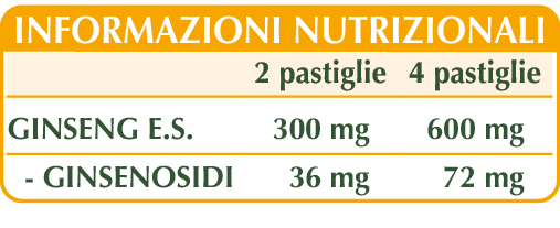 Ginseng (Panax ginseng) radici e foglie E.S. (titolato al 12% in ginsenosidi), cellulosa microcristallina°, gomma arabica°, maltodestrine da mais o riso, silicio biossido°°, magnesio stearato di origine vegetale°°.