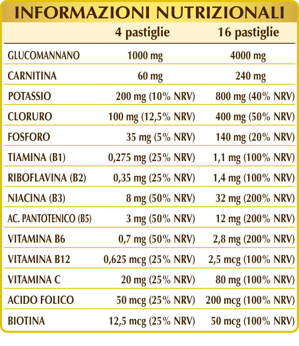 Integratore alimentare coadiuvante di diete ipocaloriche per la riduzione del peso corporeo. Il glucomannano contribuisce alla perdita di peso* e promuove il mantenimento dei normali livelli di colesterolo nel sangue**. Fosforo, vitamine B1, B2, B3, B5, B6, B12, C e biotina favoriscono il metabolismo energetico.