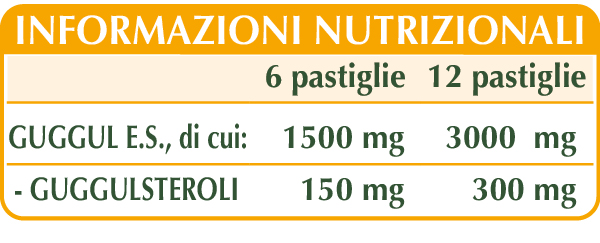Guggul (Commiphora mukul) gommo-resina E.S. (titolato al 10% in guggulsteroli), cellulosa microcristallina°, gomma arabica°, maltodestrine da mais o riso, silicio biossido°°, magnesio stearato di origine vegetale°°. °Agente di carica. °°Antiagglomerante.