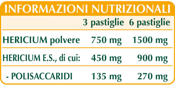 Hericium (Hericium erinaceus) sporoforo (fungo) polvere, hericium (Hericium erinaceus) sporoforo (fungo) E.S. (titolato al 30% in polisaccaridi), cellulosa microcristallina°, gomma arabica°, silicio biossido°°, magnesio stearato di origine vegetale°°.