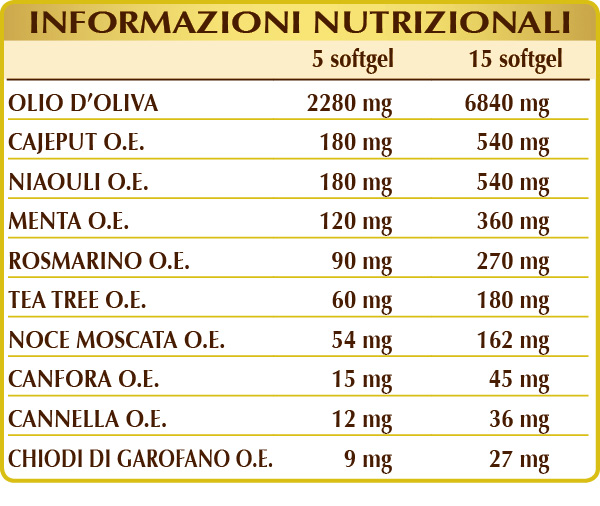 Olio d’oliva extravergine denocciolato, cajeput (Melaleuca leucadendron var. cajaputi) foglie O.E., niaouli (Melaleuca leucadendron var. viridiflora) foglie O.E., menta piperita (Mentha piperita) foglie O.E., rosmarino (Rosmarinus officinalis) sommità fiorite O.E., tea tree (Melaleuca alternifolia) foglie O.E., noce moscata (Myristica fragrans) frutti (noccioli) O.E., canfora (Cinnamomum camphora) cortecce O.E., cannella (Cinnamomum zeylanicum) cortecce O.E., chiodi di garofano (Eugenia caryophyllata) gemme floreali O.E.; eccipienti (softgel): gelatina alimentare e glicerina.
