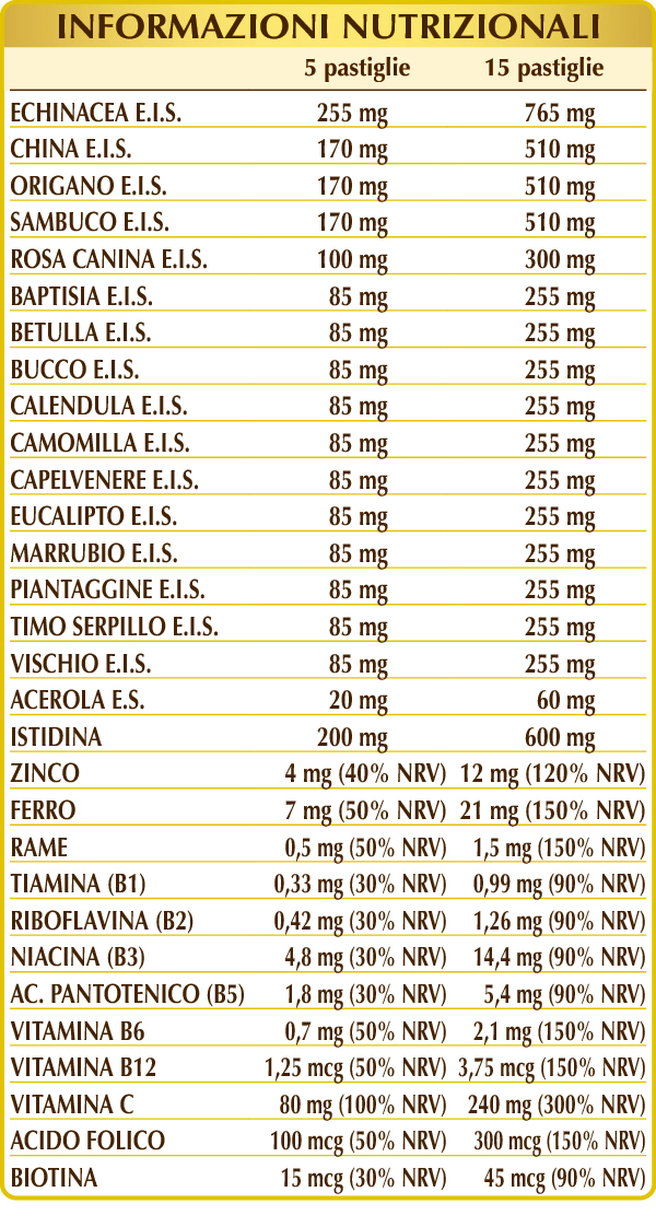 Echinacea (Echinacea angustifolia, purpurea e pallida) radici E.I.S., (L)istidina, cellulosa microcristallina°, gomma arabica°, china (Cinchona calysaya) cortecce E.I.S., origano (Origanum vulgare) foglie E.I.S., sambuco (Sambucus nigra) fiori E.I.S., rosa canina (Rosa canina) frutti E.I.S. (titolato al 70% in vitamina C), baptisia (Baptisia tinctoria) radici E.I.S., betulla bianca (Betula alba o pubescens) foglie E.I.S., bucco (Barosma betulina) foglie E.I.S., calendula (Calendula officinalis) capolini (fiori) E.I.S., camomilla volgare (Matricaria chamomilla) capolini (fiori) E.I.S., capelvenere (Adiantum capillus-veneris) erba E.I.S., eucalipto (Eucalyptus globulus) foglie E.I.S., marrubio (Marrubium vulgare) erba con fiori E.I.S., piantaggine (Plantago lanceolata) foglie E.I.S., timo serpillo (Thymus serpyllum) foglie E.I.S., vischio (Viscum album) foglie e rametti E.I.S., silicio biossido°°, ferro gluconato, zinco gluconato, magnesio stearato di origine vegetale°°, acerola (Malpighia glabra) frutti E.S. (titolato al 50% in vitamina C), vitamina B3 (nicotinamide), vitamina B5 (pantotenato di calcio), rame solfato, vitamina B6 attivata (piridossale-5-fosfato), vitamina B2 attivata (riboflavina 5-fosfato di sodio), vitamina B1 (tiamina cloridrato), acido folico attivato (L-metilfolato di calcio), biotina, vitamina B12 attivata (5-deossiadenosilcobalamina, metilcobalamina). °Agente di carica. °°Antiagglomerante.