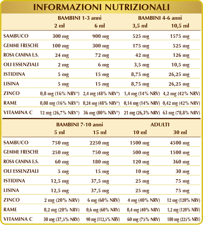 Glicerina vegetale bidistillata, miele millefiori (20%), sambuco (Sambucus nigra) fiori E.I.L., acqua pura, rosa canina (Rosa canina) frutti E.S. (titolato al 50% in vitamina C), abete bianco (Abies pectinata) gemme fresche E.I.L., acero campestre (Acer campestris) gemme fresche E.I.L., carpino bianco (Carpinus betulus) gemme fresche E.I.L., cedro del Libano (Cedrus libani) gemme fresche E.I.L., ginepro (Juniperus communis) germogli freschi (giovani getti) E.I.L., nocciolo (Corylus avellana) gemme fresche E.I.L., ontano nero (Alnus glutinosa) gemme fresche E.I.L., pino mugo (Pinus montana) gemme fresche E.I.L., ribes nero (Ribes nigrum) gemme fresche E.I.L., rosa canina (Rosa canina) germogli freschi (giovani getti) E.I.L., zinco gluconato, (L-)istidina, (L-)lisina; edulcoranti di origine naturale: glicosidi steviolici e taumatina; niaouli (Melaleuca leucadendron var. viridiflora) foglie O.E., eucalipto (Eucalyptus globulus) foglie e rametti O.E., cajeput (Melaleuca leucadendron var. cajaputi) foglie O.E., pino silvestre (Pinus sylvestris) aghi (foglie) O.E., tea tree (Melaleuca alternifolia) foglie O.E., rame gluconato.