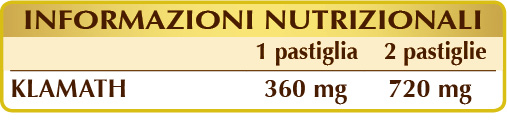 Alga klamath (Aphanizomenon flos aquae) cianobacteria polvere (tenore in ficocianine ≥ 8%), maltodestrine da mais o riso, magnesio stearato di origine vegetale°°, silicio biossido°°, gomma arabica°, cellulosa microcristallina°.