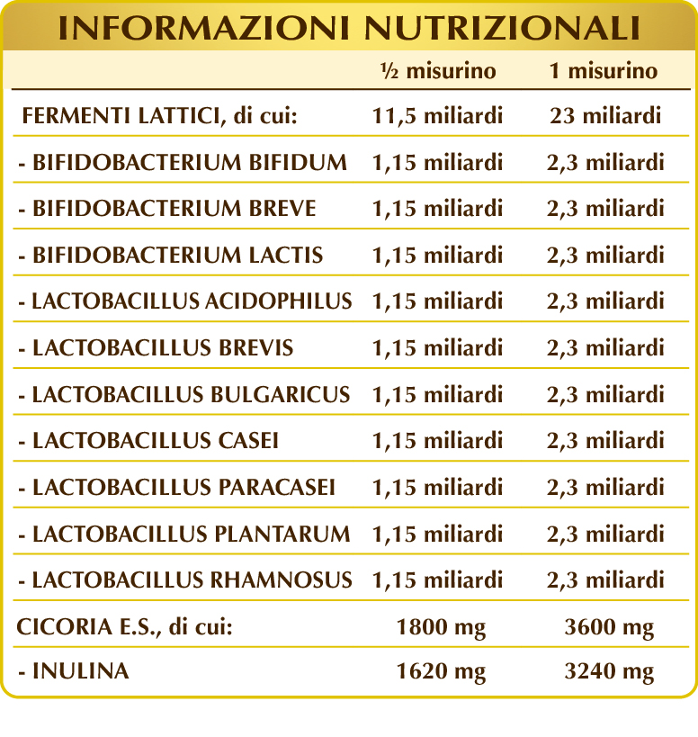Cicoria (Cichorium intybus) radici E.S. (titolato al 90% in inulina), maltodestrine da mais o riso, miscela di fermenti lattici (titolata al 10% in ognuno dei seguenti ceppi: Bifidobacterium bifidum SD5215, breve SD5206, lactis SD5219; Lactobacillus acidophilus SD5212, brevis SD5214, bulgaricus SD5589, casei SD5213, paracasei SD5275, plantarum SD5209, rhamnosus SD5217).