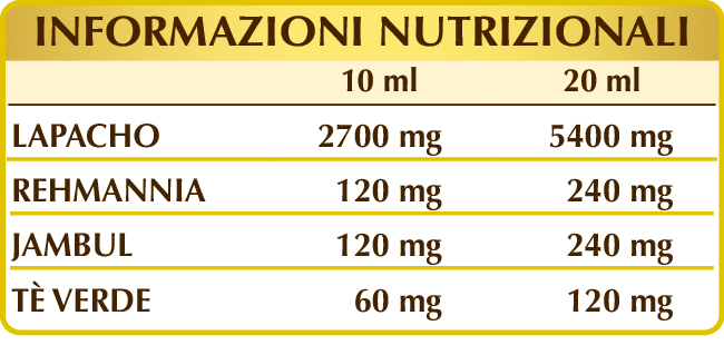 Il lapacho è utile per favorire le naturali difese dell’organismo, la regolarità del processo di sudorazione, le funzioni depurative e la funzionalità delle prime vie respiratorie. Inoltre, promuove la regolarità della pressione arteriosa e il benessere dell’apparato cardiovascolare. La rehmannia coadiuva la funzione epatica, i semi di jambul il metabolismo dei carboidrati e il tè verde svolge un’azione antiossidante.