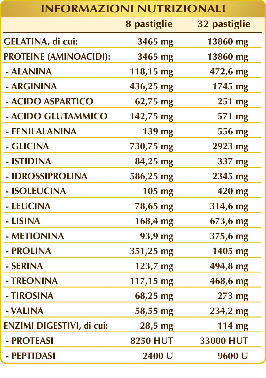 Gelatina alimentare (da pelle bovina), amido di riso, cellulosa microcristallina°, gomma di guar°, silicio biossido°°, proteasi (500.000 HUT/g) di origine vegetale (Aspergillus oryzae), peptidasi (200.000 U/g), magnesio starato di origine vegetale°°.°Agente di carica. °° Antiagglomerante.