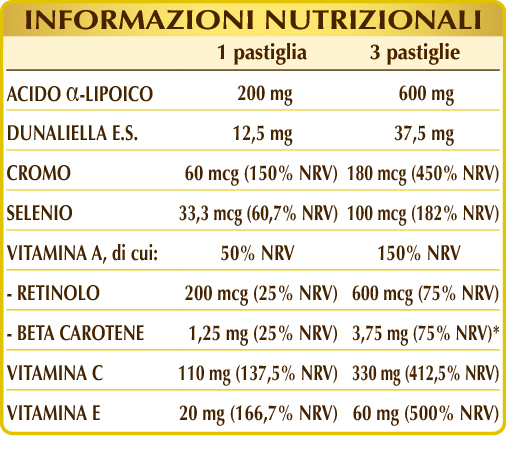 Integratore alimentare a base di acido lipoico, sali minerali e vitamine. Vitamina C, E e selenio contribuiscono alla protezione delle cellule dallo stress ossidativo. La vitamina A interviene nel processo di specializzazione delle cellule e con la dunaliella promuove il mantenimento della capacità visiva. Il cromo, infine, favorisce il mantenimento dei normali livelli di glucosio nel sangue.