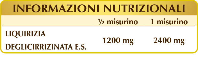 Estratto secco deglicirrizinato di liquirizia (Glycyrrhiza glabra) radici (titolato allo 3% in acido glicirrizico o glicirrizina), maltodestrine da mais o riso; edulcoranti di origine naturale: glicosidi steviolici da stevia, taumatina.