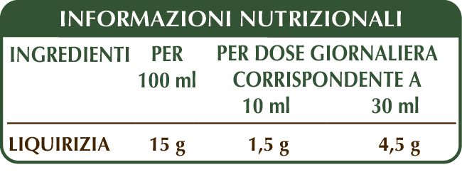 Estratto Integrale Liquido analcoolico ottenuto a partire da: glicerina vegetale bidistillata, acqua pura, liquirizia (Glycyrrhiza glabra) radici.