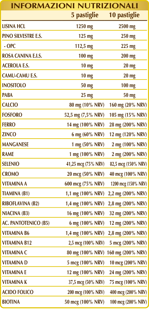 (L-)lisina HCL o cloridrato, calcio fosfato bibasico, pino silvestre (Pinus sylvestris) cortecce E.S. (titolato al 90% in proantocianidine oligomeriche o OPC), cellulosa microcristallina°, gomma arabica°, rosa canina (Rosa canina) frutti E.I.S. (titolato al 70% in vitamina C), citrato ferrico di ammonio, mio-inositolo di origine vegetale (estratto da semi di mais), silicio biossido°°, zinco gluconato, calcio carbonato, vitamina E di origine vegetale (acetato di D-α-tocoferile), PABA (acido p-aminobenzoico), vitamina B3 (nicotinamide), magnesio stearato di origine vegetale°°, acerola (Malpighia glabra) frutti E.S. (titolato al 50% in vitamina C), camu-camu (Myrciaria dubia) frutti E.S. (titolato al 50% in vitamina C), manganese gluconato, rame gluconato, vitamina B5 (pantotenato di calcio), vitamina A (acetato di retinile), vitamina B2 attivata (riboflavina 5-fosfato di sodio), vitamina B6 attivata (piridossale-5-fosfato), lichene (Cladonia rangiferina) tallo E.S. (titolato in vitamina D3 colecalciferolo 100.000 UI/g), vitamina B1 (tiamina cloridrato), acido folico attivato (L-metilfolato di calcio), cromo picolinato, sodio selenito, biotina, vitamina K1 (fillochinone), vitamina B12 attivata (5-deossiadenosilcobalamina, meticobalamina).°Agente di carica. °°Antiagglomerante.