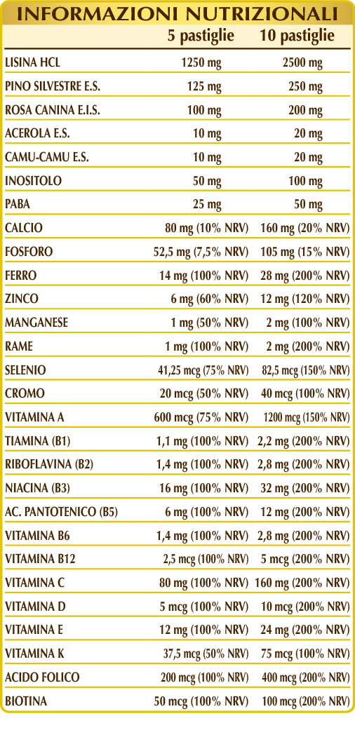 Integratore alimentare a base di lisina, sali minerali, vitamine e altri nutritivi. Ferro, zinco, rame, selenio e vitamine A, B6, B12, C, D e acido folico contribuiscono alla normale funzione del sistema immunitario. La vitamina D, inoltre, promuove la funzione muscolare e, insieme a calcio e fosforo, mantiene il benessere di ossa e denti.