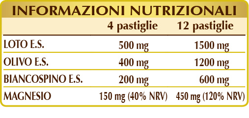 Loto (Nelumbo nucifera) semi E.S. (titolato allo 0,6% in liensinina), olivo (Olea europaea) foglie E.S. (titolato al 40% in oleuropeina), cellulosa microcristallina°, gomma arabica°, magnesio ossido, biancospino (Crataegus oxyacantha) fiori e foglie E.S. (titolato al 40% in flavonoidi), silicio biossido°°, magnesio stearato di origine vegetale°°.