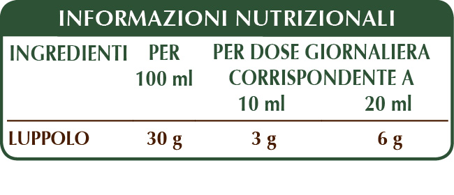 Estratto Integrale Liquido analcoolico ottenuto a partire da: glicerina vegetale bidistillata, acqua pura, luppolo (Humulus lupulus) strobili (fiori femminili).
