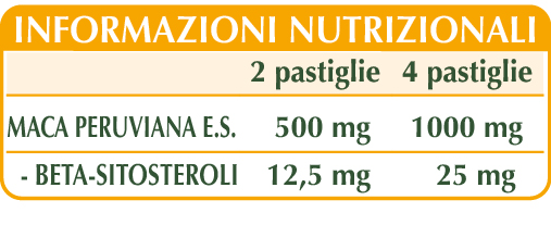 Maca peruviana (Lepidium meyenii) radici E.S. (titolato al 2,5% in beta-sitosteroli), maltodestrine da mais o riso, cellulosa microcristallina°, gomma arabica°, silicio biossido°°, magnesio stearato di origine vegetale°°.