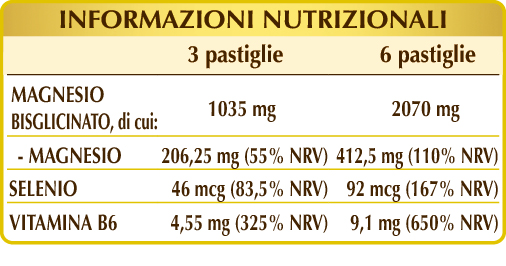 Integratore alimentare a base di magnesio bisglicinato, fonte di magnesio in forma organica chelata ad elevata biodisponibilità, in cui il magnesio è legato a due molecole dell’aminoacido glicina. Arricchito con vitamina B6 e selenio ad azione coadiuvante. Il magnesio interviene nei processi di divisione cellulare e favorisce l’equilibrio elettrolitico, la sintesi proteica e la normale funzione muscolare. Con la vitamina B6 contribuisce al funzionamento del sistema nervoso, sostiene le normali funzioni psicologiche, promuove il metabolismo energetico e aiuta a contrastare la stanchezza e l’affaticamento. Inoltre, mantiene il benessere di ossa e denti, mentre il selenio contribuisce mantenimento di capelli e unghie sani e favorisce la protezione delle cellule dallo stress ossidativo.