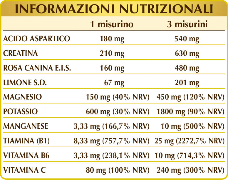 Maltodestrine da mais o riso, potassio citrato, magnesio citrato bibasico, creatina monoidrato, magnesio pidolato, magnesio gluconato, potassio gluconato, acido (L-)aspartico, rosa canina (Rosa canina) frutti E.I.S. (titolato al 50% in vitamina C), limone (Citrus limon) frutti S.D., acido citrico; aroma naturale: limone (Citrus limon) scorze dei frutti O.E.; manganese gluconato, vitamina B1 (tiamina cloridrato), vitamina B6 (piridossale-5-fosfato); edulcoranti di origine naturale: glicosidi steviolici da stevia, taumatina. Con edulcoranti di origine naturale.