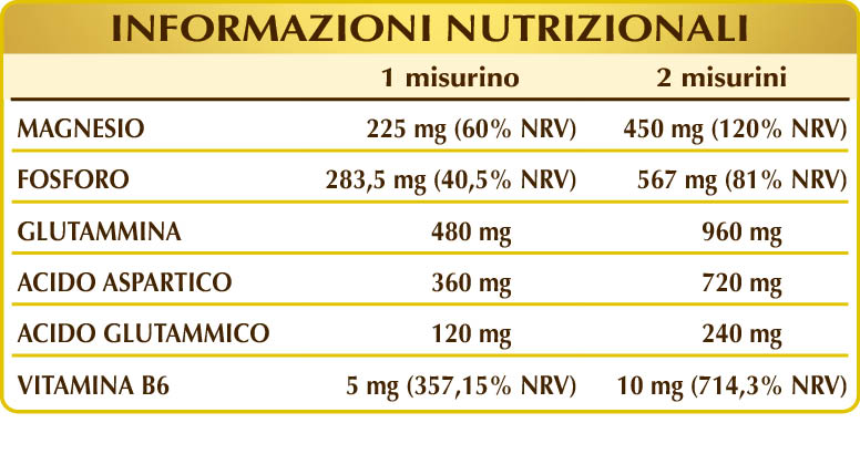 Integratore alimentare a base di magnesio e aminoacidi. Il magnesio interviene nei processi di divisione cellulare e può favorire l’equilibrio elettrolitico, la sintesi proteica e la normale funzione muscolare. Con la vitamina B6 contribuisce al funzionamento del sistema nervoso, sostiene le normali funzioni psicologiche, promuove il metabolismo energetico e aiuta a contrastare la stanchezza e l’affaticamento. Inoltre, insieme al fosforo, mantiene il benessere di ossa e denti.