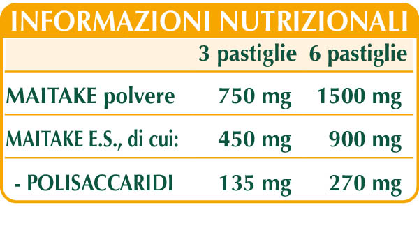 Maitake (Grifola frondosa) sporoforo (fungo) polvere, maitake (Grifola frondosa) sporoforo (fungo) E.S. (titolato al 30% in polisaccaridi), cellulosa microcristallina°, gomma arabica°, silicio biossido°°, magnesio stearato di origine vegetale°°.