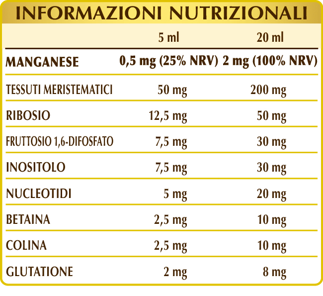 Glicerina vegetale bidistillata, acqua pura; macerato glicerico di tessuti meristematici freschi: ribes nero (Ribes nigrum) gemme, faggio (Fagus sylvatica) gemme, betulla bianca (Betula alba, sinonimi Betula pubescens, Betula verrucosa o Betula pendula) gemme, lampone (Rubus idaeus) giovani getti; ribosio, fruttosio 1,6-difosfato; correttore di acidità: acido citrico; inositolo, betaina citrato, colina tartrato; miscela di nucleotidi: AMP (adenosina monofosfato), CMP (citosina monofosfato), GMP (guanosina monofosfato), UMP (uridina monofosfato); manganese gluconato, glutatione ridotto; edulcorante di origine naturale: taumatina. Con edulcoranti di origine naturale.