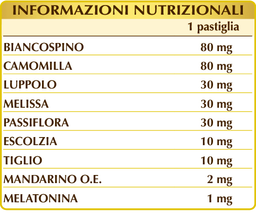Biancospino (Crataegus oxyacantha) fiori e foglie Plv, camomilla volgare (Matricaria chamomilla) capolini (fiori) Plv, cellulosa microcristallina°, gomma arabica°, luppolo (Humulus lupulus) strobili (fiori femminili) Plv, melissa (Melissa officinalis) foglie Plv, passiflora (Passiflora incarnata) erba con fiori Plv, silicio biossido°°, escolzia (Eschscholzia californica) erba Plv, tiglio (Tilia platyphyllos) fiori Plv, mandarino (Citrus reticulata) scorze dei frutti O.E., melatonina, magnesio stearato di origine vegetale°°.