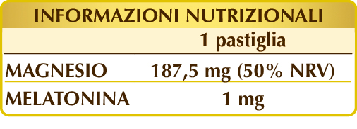 La melatonina contribuisce alla riduzione del tempo richiesto per prendere sonno e allevia gli effetti del jet-lag*. Il magnesio può contrastare la stanchezza e l’affaticamento promuovendo il metabolismo energetico. Contribuisce al funzionamento del sistema nervoso e mantiene le normali funzioni psicologiche. Interviene nei processi di divisione cellulare, favorisce l’equilibrio elettrolitico, la sintesi proteica, la normale funzione muscolare e il benessere di ossa e denti.