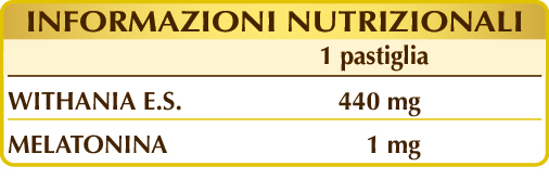 Withania o ginseng indiano (Withania somnifera) radici E.S. (titolato al 2,5% in withanolidi), cellulosa microcristallina°, gomma arabica°, silicio biossido°°, magnesio stearato di origine vegetale°°, melatonina.