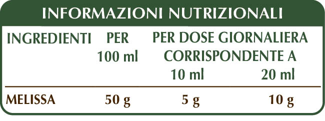Estratto Integrale Liquido analcoolico ottenuto a partire da: glicerina vegetale bidistillata, acqua pura, melissa (Melissa officinalis) foglie.