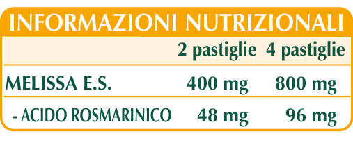 Melissa (Melissa officinalis) foglie E.S. (titolato al 12% in acido rosmarinico), maltodestrine da mais o riso, cellulosa microcristallina°, gomma arabica°, silicio biossido°°, magnesio stearato di origine vegetale°°.