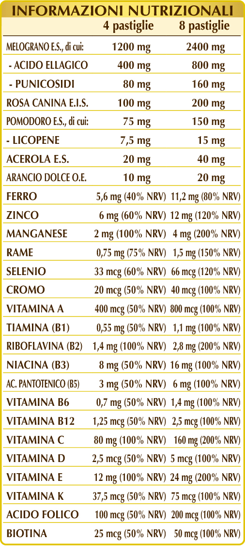 Melograno (Punica granatum) frutti E.S. (titolato al 40% in acido ellagico), melograno (Punica granatum) frutti E.S. (titolato al 40% in punicosidi), cellulosa microcristallina°, gomma arabica°, rosa canina (Rosa canina) frutti E.I.S. (titolato al 70% in vitamina C), pomodoro (Solanum lycopersicum) frutti E.S. (titolato al 10% in licopene), ferro gluconato, zinco gluconato, silicio biossido°°, vitamina E di origine naturale (acetato di D-α-tocoferile), acerola E.S. (Malpighia glabra) frutti E.S. (titolato al 50% in vitamina C), manganese gluconato; aroma naturale: arancio dolce (Citrus aurantium var. sinensis o dulcis) scorze dei frutti O.E.; magnesio stearato di origine vegetale°°, vitamina B3 (nicotinamide), vitamina B5 (pantotenato di calcio), rame solfato, vitamina A (acetato di retinile), vitamina B2 attivata (riboflavina 5-fosfato di sodio), vitamina B6 attivata (piridossale-5-fosfato), lichene (Cladonia rangiferina) tallo E.S. (titolato in vitamina D3 colecalciferolo 100.000 UI/g), vitamina B1 (tiamina), cromo picolinato, acido folico attivato (L-metilfolato di calcio), sodio selenito, vitamina K1 (fillochinone), biotina, vitamina B12 attivata (5-deossiadenosilcobalamina, metilcobalamina). °Agente di carica. °°Antiagglomerante.