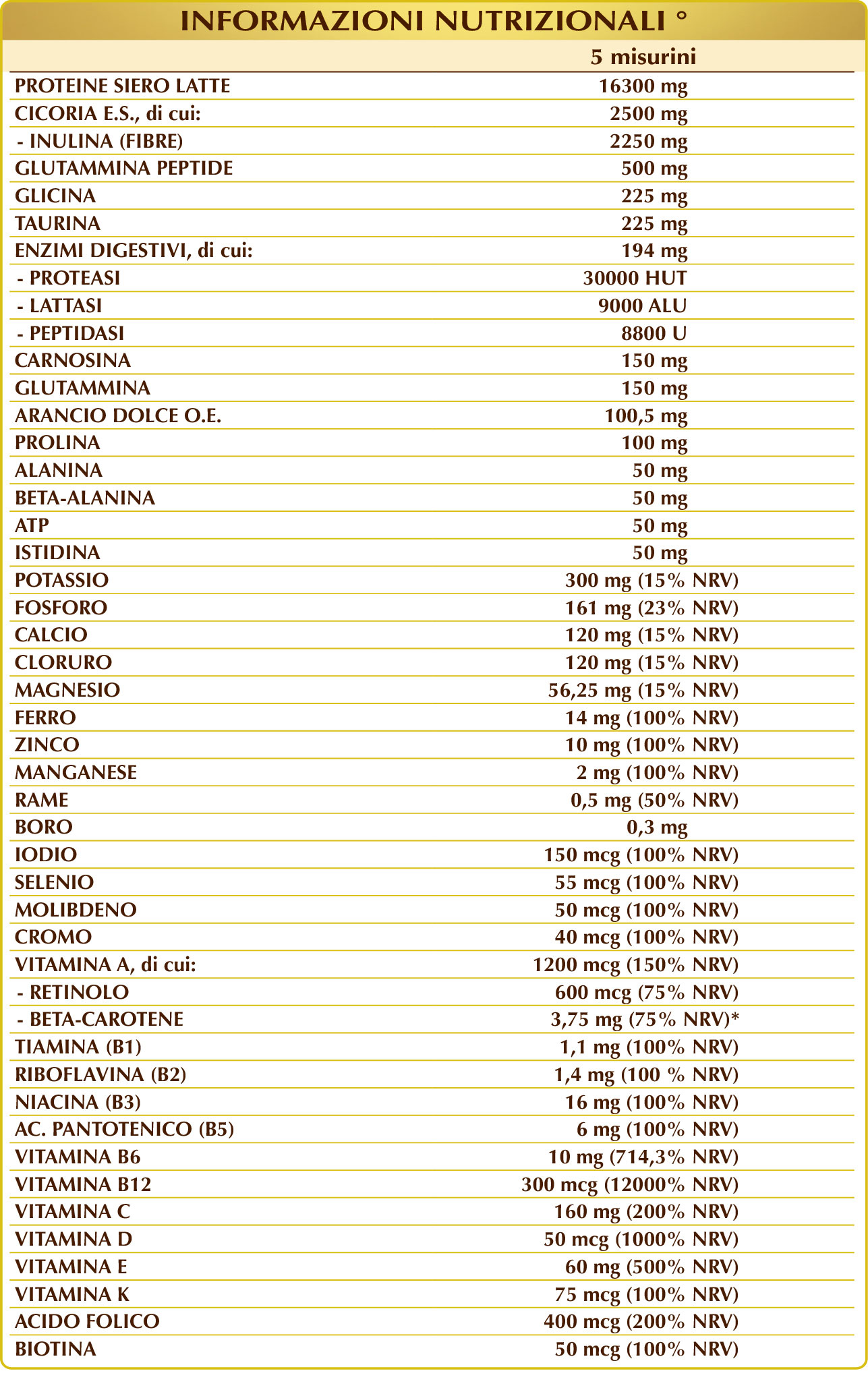 Proteine del siero del latte, cicoria (Cichorium intybus) radici E.S. (titolato al 90% in inulina), calcio glicerofosfato, glutammina peptide, magnesio glicerofosfato, potassio citrato, potassio cloruro, glicina, taurina, vitamina C (acido ascorbico), (L-)carnosina, (L-)glutammina, vitamina E (acetato di DL-α-tocoferile), ferro gluconato, (L-)prolina; aroma naturale: arancio dolce (Citrus aurantium var. sinensis o dulcis) scorze dei frutti O.E; lattasi (100.000 ALU/g), zinco gluconato, ATP (adenosina trifosfato sale sodico), (L-)alanina, beta-alanina, (L-)istidina, proteasi (500.000 HUT/g), peptidasi (200.000 U/g), dunaliella (Dunaliella salina) tallo (alga) E.S. (titolato al 10% in beta-carotene), vitamina D3 (colecalciferolo 100.000 UI/g), manganese gluconato, vitamina B3 (nicotinamide), vitamina B6 attivata (piridossale 5-fosfato); edulcoranti di origine naturale: glicosidi steviolici da stevia e taumatina; vitamina B5 (pantotenato di calcio), vitamina A (acetato di retinile), rame gluconato, sodio borato, vitamina B2 attivata (riboflavina 5-fosfato di sodio), vitamina B1 (tiamina cloridrato), acido folico attivato (L-metilfolato di calcio), cromo picolinato, vitamina B12 attivata (5-deossiadenosilcobalamina, metilcobalamina), potassio ioduro, sodio molibdato, sodio selenito, vitamina K1 (fillochinone), biotina.