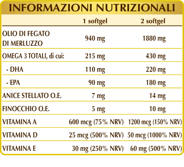 Integratore alimentare a base di olio di fegato di merluzzo, sostanza naturalmente ricca di vitamina A e D e di acidi grassi polinsaturi essenziali (omega 3). La vitamina A è utile per regolare il metabolismo del ferro, per coadiuvare la capacità visiva e per mantenere il benessere di pelle e mucose. La vitamina D favorisce l’assorbimento e l’utilizzo di calcio e fosforo, mantiene la funzione muscolare e il benessere di ossa e denti. Le due vitamine contribuiscono insieme alla normale funzione del sistema immunitario mentre la vitamina E protegge le cellule dallo stress ossidativo. Inoltre, il DHA e l’EPA contribuiscono al mantenimento della normale funzione cardiaca*. *Gli effetti benefici si ottengono con l’assunzione di almeno 250 mg di DHA+EPA al giorno.