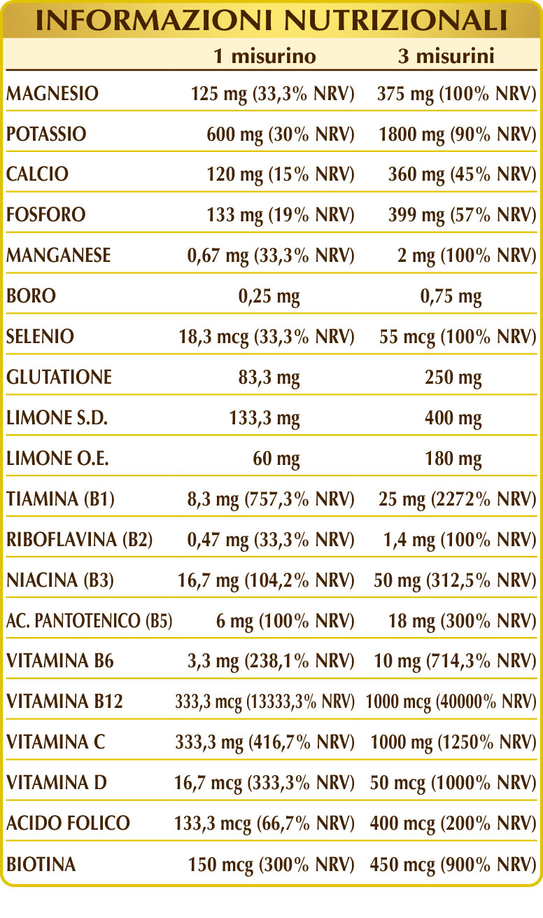 Maltodestrine da mais e riso, potassio citrato, magnesio citrato bibasico, calcio glicerofosfato, magnesio glicerofosfato, vitamina C (acido ascorbico), magnesio gluconato, magnesio pidolato, potassio gluconato, limone (Citrus limon) frutti S.D., glutatione ridotto; aroma naturale: limone (Citrus limon) scorze dei frutti O.E.; vitamina B3 (nicotinamide), vitamina B1 (tiamina cloridrato), vitamina B5 (pantotenato di calcio), lichene (Cladonia rangiferina) tallo E.S. (titolato in vitamina D3 colecalciferolo 100.000 UI/g), manganese gluconato, vitamina B6 attivata (piridossale 5-fosfato); edulcoranti di origine naturale: glicosidi steviolici da stevia, taumatina; sodio borato, vitamina B2 attivata (riboflavina 5-fosfato di sodio), vitamina B12 attivata (5-deossiadenosilcobalamina e metilcobalamina), biotina, acido folico attivato (L-metilfolato di calcio), sodio selenito. E.S.= Estratto secco.