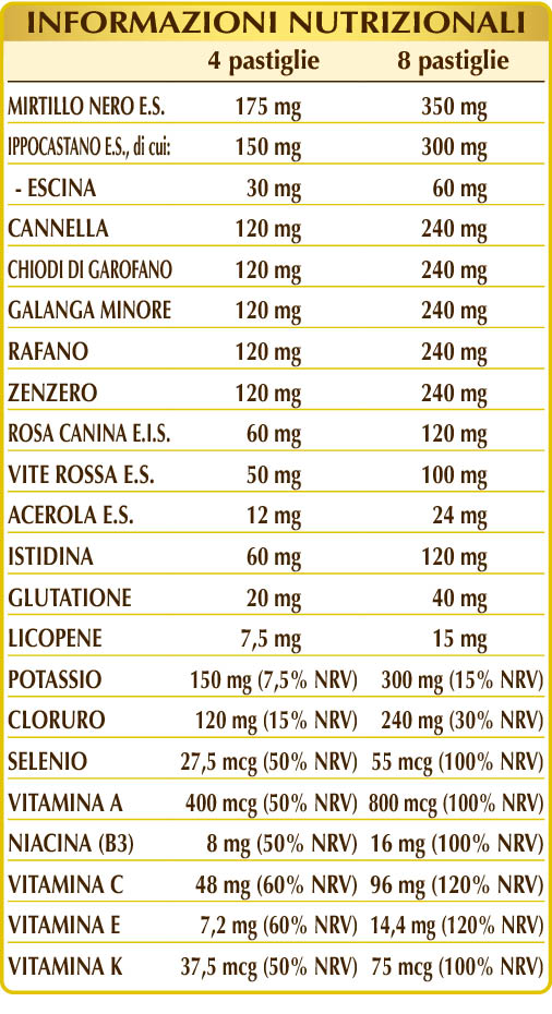 Potassio cloruro, cellulosa microcristallina°, gomma arabica°, mirtillo nero (Vaccinium myrtillus) frutti E.S. (titolato al 25% in antocianosidi), ippocastano (Aesculus hippocastanum) semi E.S. (titolato al 20% in escina), cannella (Cinnamomum zeylanicum) cortecce Plv, chiodi di garofano (Eugenia caryophyllata) gemme floreali Plv, galanga minore (Alpinia officinarum) rizomi Plv, rafano (Armoracia rusticana) radici Plv, zenzero (Zingiber officinalis) rizomi Plv, pomodoro (Solanum lycopersicum) frutti E.S. (titolato al 10% in licopene), (L-)istidina, rosa canina (Rosa canina) frutti E.I.S. (titolato al 70% in vitamina C), vite rossa (Vitis vinifera) semi E.S. (titolato al 95% in proantocianidine oligomeriche), potassio citrato, silicio biossido°°, glutatione ridotto, vitamina E di origine naturale (acetato di D-α-tocoferile), potassio gluconato, acerola (Malpighia glabra) frutti E.S. (titolato al 50% in vitamina C), magnesio stearato di origine vegetale°°, vitamina B3 (nicotinamide), vitamina A (acetato di retinile), vitamina K1 (fillochinone), sodio selenito. Plv= Polvere. °Agente di carica. °°Antiagglomerante.