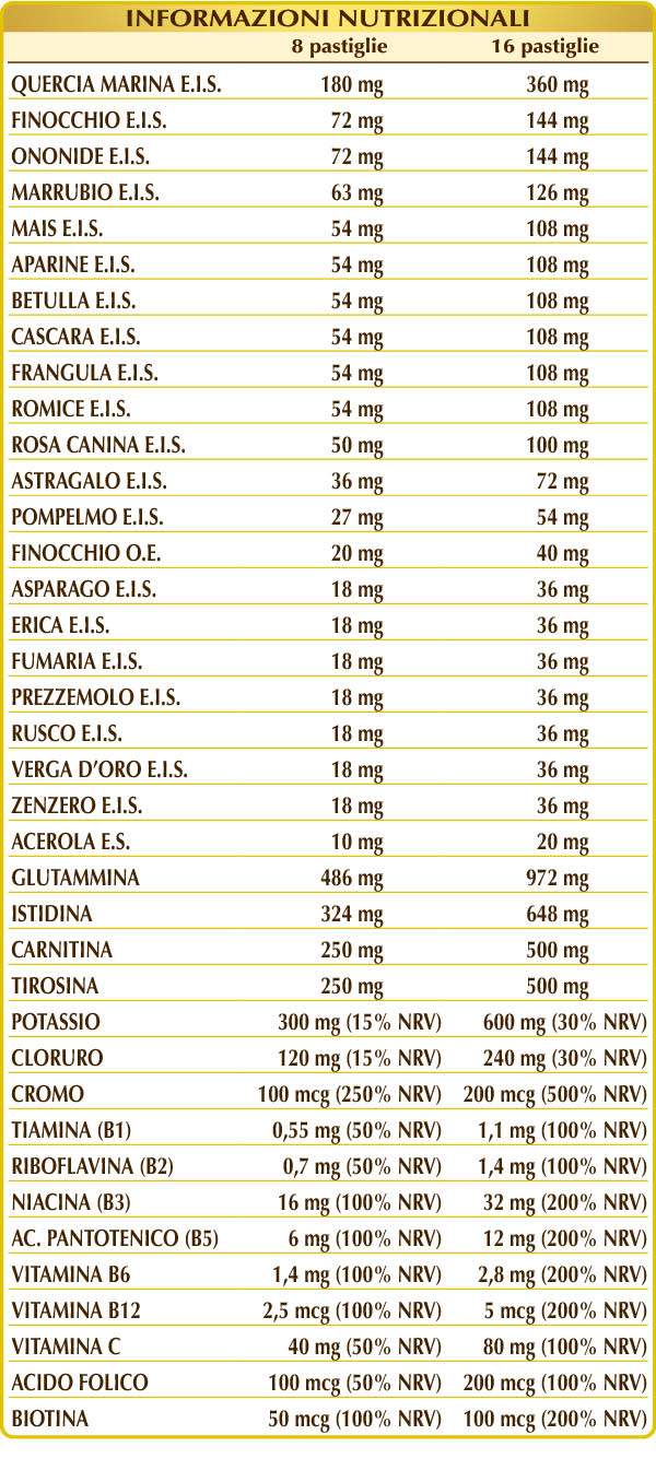 (L-)glutammina, potassio citrato, cellulosa microcristallina°, gomma arabica°, (L-)istidina, potassio cloruro, (L-)carnitina, (L-)tirosina (da fermentazione), quercia marina (Fucus vesiculosus) tallo (alga) E.I.S., silicio biossido°°, finocchio (Foeniculum vulgare) frutti E.I.S., ononide (Ononis spinosa) radici E.I.S., marrubio (Marrubium vulgare) erba con fiori E.I.S., aparine (Galium aparine) erba con fiori E.I.S., betulla bianca (Betula alba o pubescens) foglie E.I.S., cascara (Rhamnus purshiana) cortecce E.I.S., frangula (Rhamnus frangula) cortecce E.I.S., mais o granoturco (Zea mays) stigmi E.I.S., romice (Rumex crispus) radici E.I.S., rosa canina (Rosa canina) frutti E.I.S. (titolato al 70% in vitamina C), astragalo (Astragalus membranaceus) radici E.I.S., pompelmo (Citrus paradisi) semi E.I.S., finocchio (Foeniculum vulgare) frutti O.E., asparago (Asparagus officinalis) radici E.I.S., erica (Calluna vulgaris) erba con fiori E.I.S., fumaria (Fumaria officinalis) erba con fiori E.I.S., prezzemolo (Petroselinum crispum) radici E.I.S., rusco o pungitopo (Ruscus aculeatus) radici E.I.S., verga d’oro (Solidago virga-aurea) erba con fiori E.I.S., zenzero (Zingiber officinalis) rizomi E.I.S., vitamina B3 (nicotinamide), magnesio stearato di origine vegetale°°, acerola (Malpighia glabra) frutti E.S. (titolato al 50% in vitamina C), vitamina B5 (pantotenato di calcio), vitamina B6 attivata (piridossale-5-fosfato), vitamina B2 attivata (riboflavina 5-fosfato di sodio), cromo picolinato, vitamina B1 (tiamina cloridrato), acido folico attivato (L-metilfolato di calcio), biotina, vitamina B12 attivata (5-deossiadenosilcobalamina, metilcobalamina). °Agente di carica. °°Antiagglomerante.