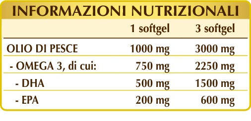 Olio di pesce (titolato al 75% in omega 3 totali, di cui almeno 50% DHA e 20% EPA); eccipienti (softgel): gelatina alimentare e glicerina. Softgel da 1450 mg, di cui 1000 mg di prodotto netto e 450 mg di eccipienti involucro.