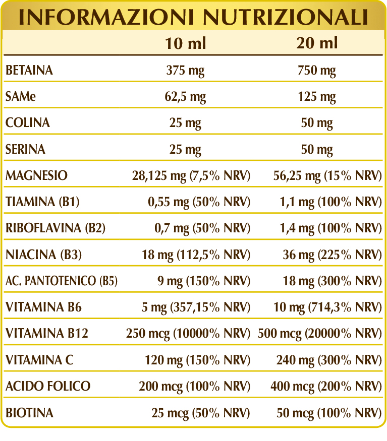 Glicerina vegetale bidistillata, acqua pura, betaina, magnesio glicerofosfato, SAMe (S-adenosil metionina disolfato tosilato), vitamina C (acido ascorbico), colina tartrato, (L-)serina, vitamina B3 (nicotinamide), vitamina B5 (pantotenato di calcio), vitamina B6 attivata (piridossale-5-fosfato); edulcoranti di origine naturale: glicosidi steviolici da stevia, taumatina; vitamina B2 attivata (riboflavina 5-fosfato di sodio), vitamina B1 (tiamina cloridrato), acido folico attivato (L-metilfolato di calcio), biotina, vitamina B12 attivata (5-deossiadenosilcobalamina e metilcobalamina).