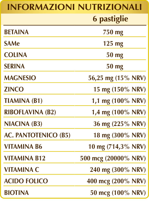 Betaina, magnesio glicerofosfato, cellulosa microcristallina°, gomma arabica°, SAMe (S-adenosil metionina disolfato tosilato), vitamina C (acido ascorbico), colina tartrato, zinco gluconato, (L-)serina, vitamina B3 (inositolo esanicotinato, nicotinamide), vitamina B5 (pantotenato di calcio), vitamina B6 attivata (piridossale-5-fosfato), vitamina B2 attivata (riboflavina 5-fosfato di sodio), vitamina B1 (tiamina cloridrato), acido folico attivato (L-metilfolato di calcio), biotina, vitamina B12 attivata (5-deossiadenosilcobalamina e metilcobalamina). °Agente di carica. °°Antiagglomerante.