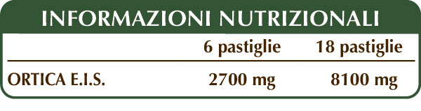 Ortica (Urtica dioica) radici e foglie E.I.S., cellulosa microcristallina°, gomma arabica°, silicio biossido°°, magnesio stearato di origine vegetale°°.
