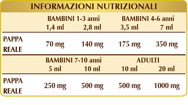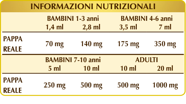 Integratore alimentare contenente pappa reale fresca studiato appositamente per bambini da 1 a 10 anni e per adulti. La pappa reale, prodotta dalle api operaie, rappresenta un “superalimento” altamente nutritivo utilizzato dalle api stesse per nutrire tutte le larve fino a tre giorni di età e impiegato per nutrire l’ape regina per tutta la durata della sua lunga vita.